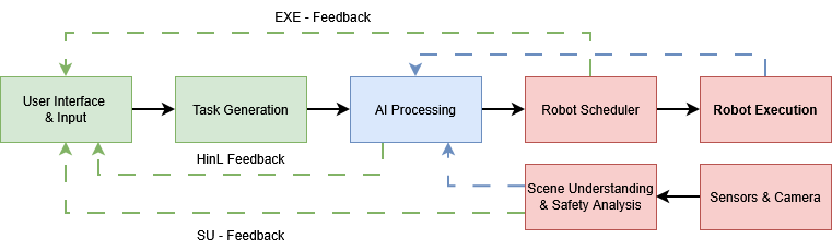 The resulting tasks are executed through robotics middleware such as ROS, enabling integration with a wide range of robotic platforms. Throughout the process, the human operator maintains situational awareness through visual feedback and can intervene or refine instructions when needed.